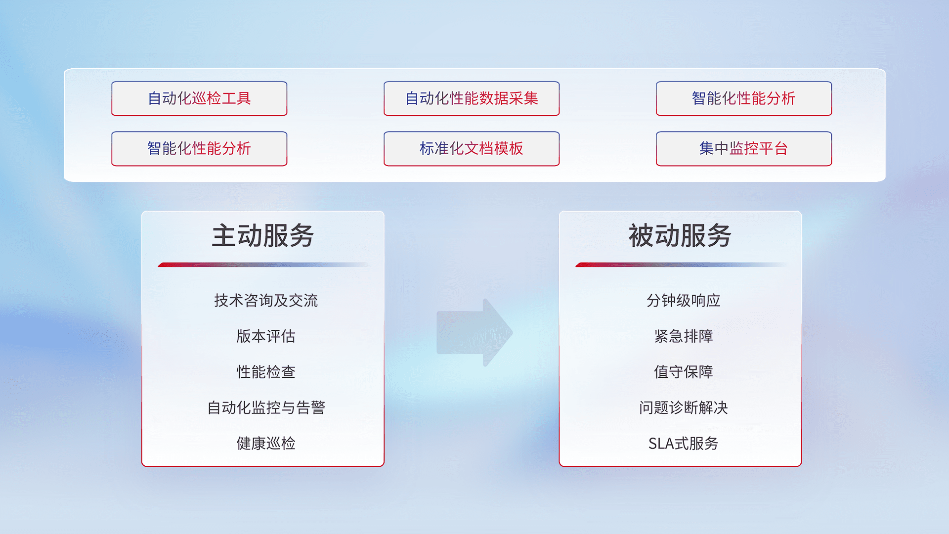 智能化工具和标准化文档,,,,保障服务质量,,,提供主动服务(包含技术咨询、、、版本评估、、、性能检查、、、自动化监控与告警、、、、健康巡检)和被动服务包含(分钟级响应、、、、紧急排障、、值守保障、、问题诊断解决、、、、SLA服务)。。。